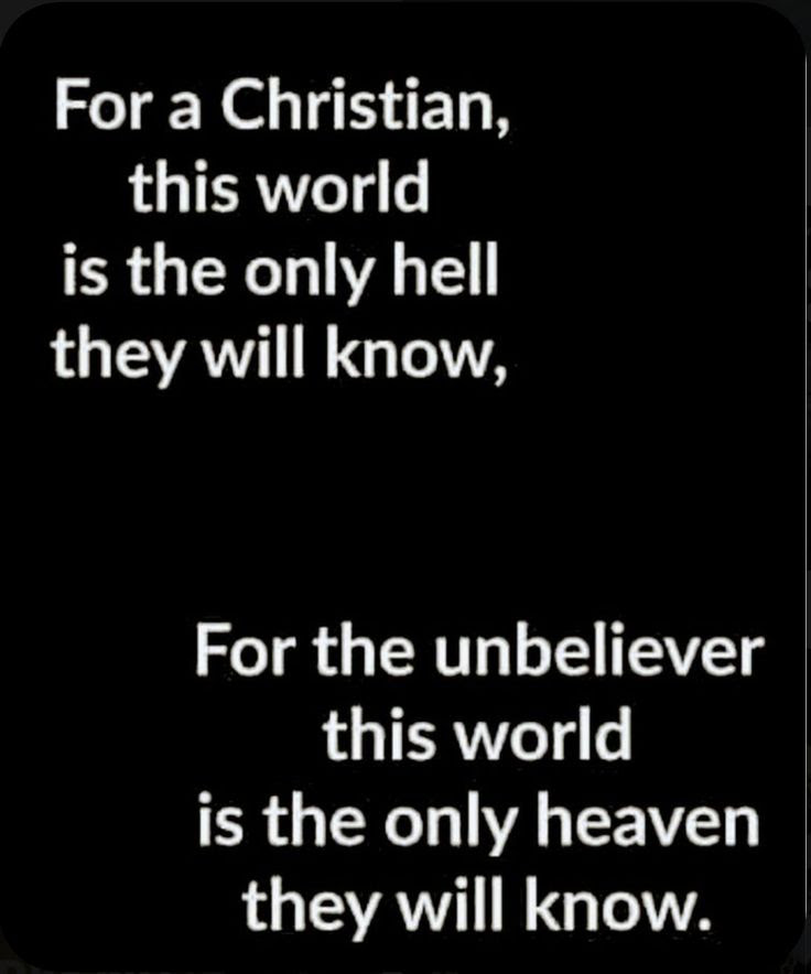 For a Christian this world is the only hell they will know, For the unbeliever this world is the only heaven they will know.